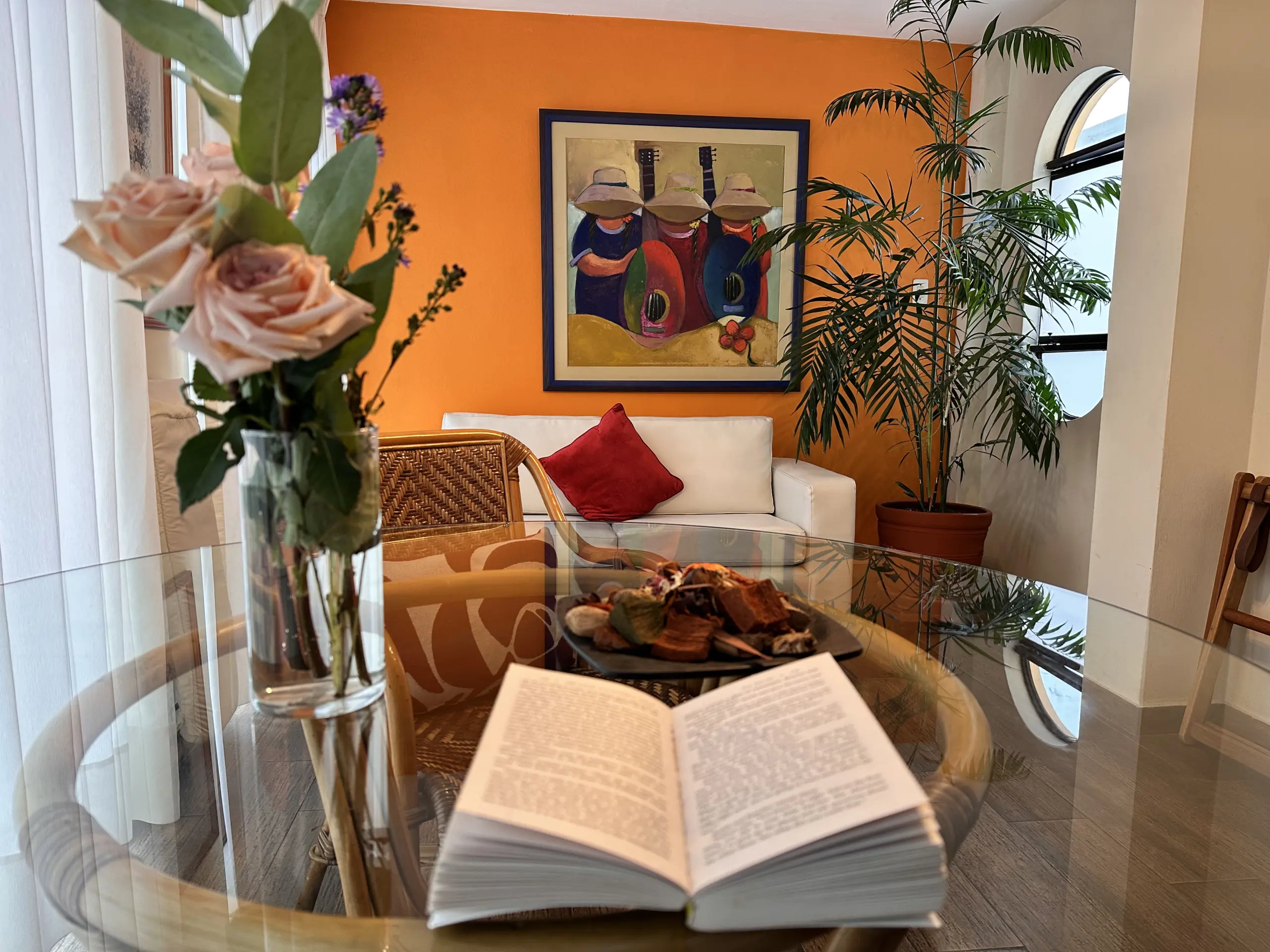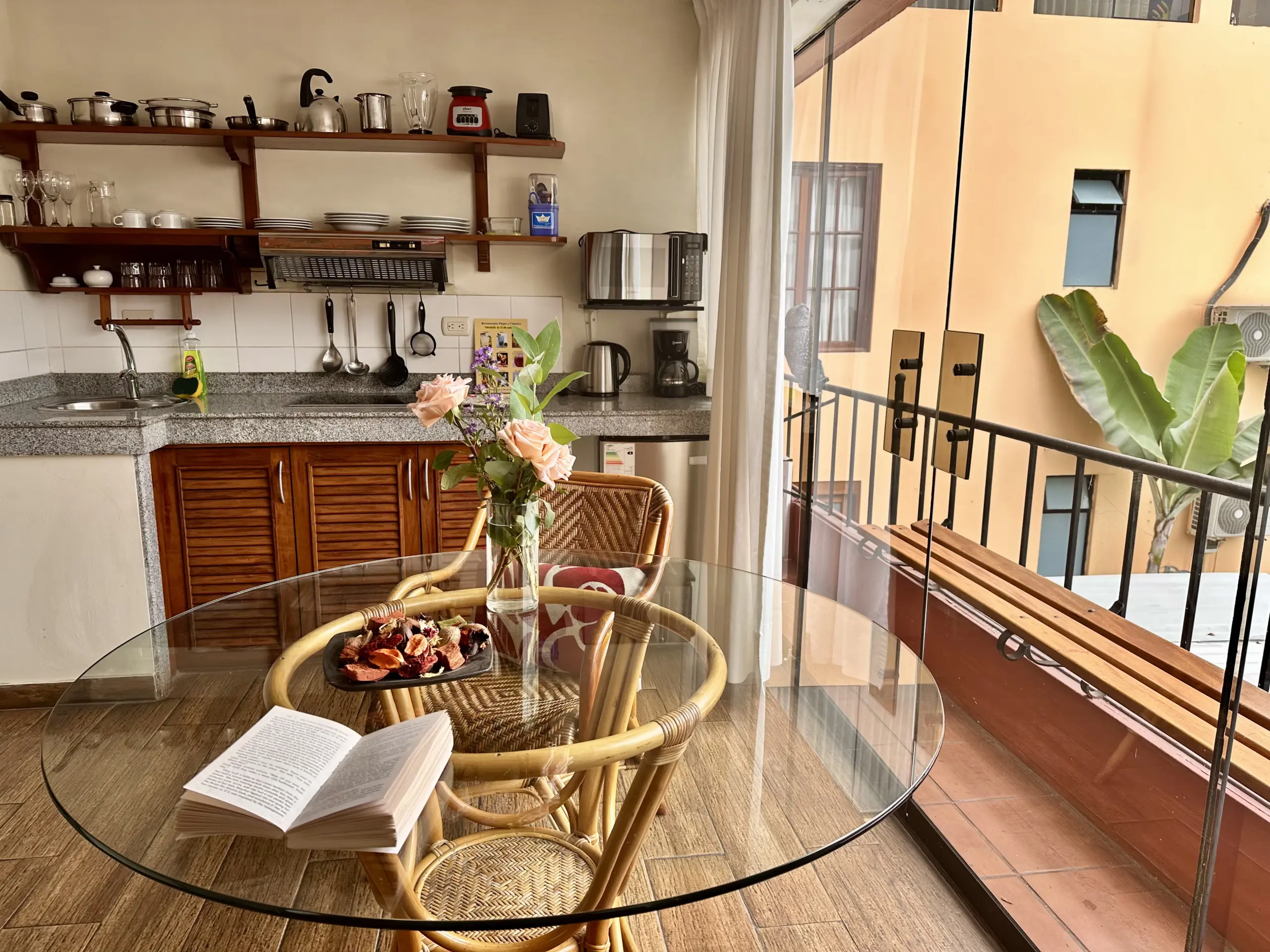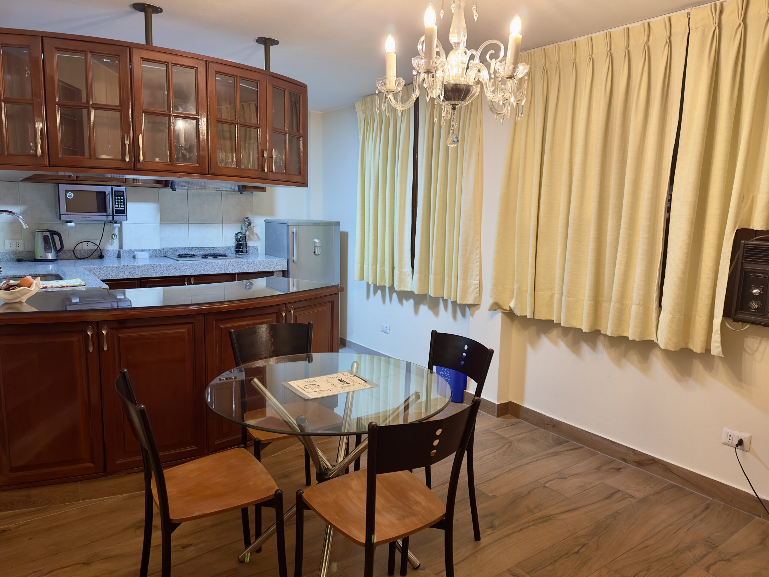 Ideal para 2 personas, cuenta con cama Queen size, tiene ambiente amplio, cocina equipada con menajes, vajillas y espacio para compartir cómodamente.